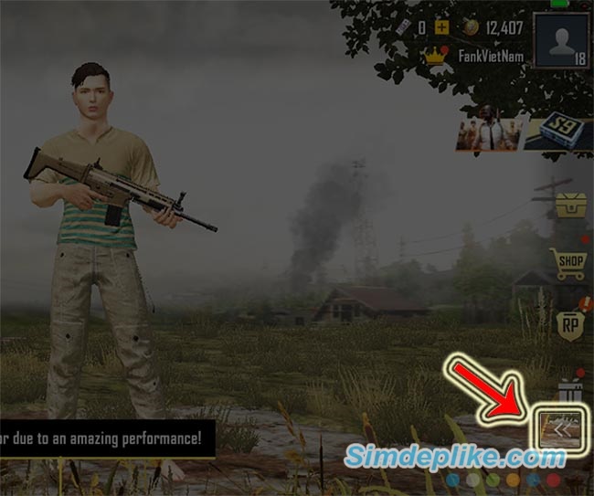 Rất đơn giản, các bạn chỉ cần đăng nhập vào tài khoản chơi PUBG Mobile của mình. Sau đó, từ giao diện chính, các bạn chọn vào biểu tượng mũi tên ở bên góc phải màn hình như dưới đây.