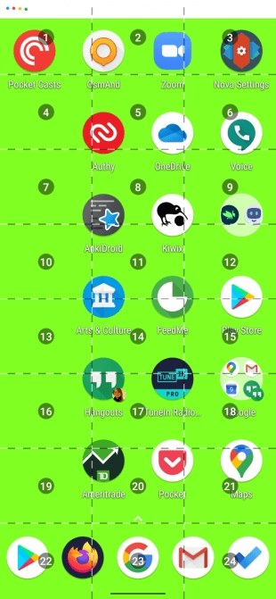 Ví dụ, nói open grid sẽ chia màn hình thành khung lưới. Nói swipe 23 up sau đó, sẽ mở ngăn kéo ứng dụng, tương ứng với ảnh chụp màn hình bên phải. Nói zoom in – phóng to trên bất kỳ nhân tố nào bạn muốn trên màn hình. Tính năng này đặc biệt hữu ích với người có thị lực kém.