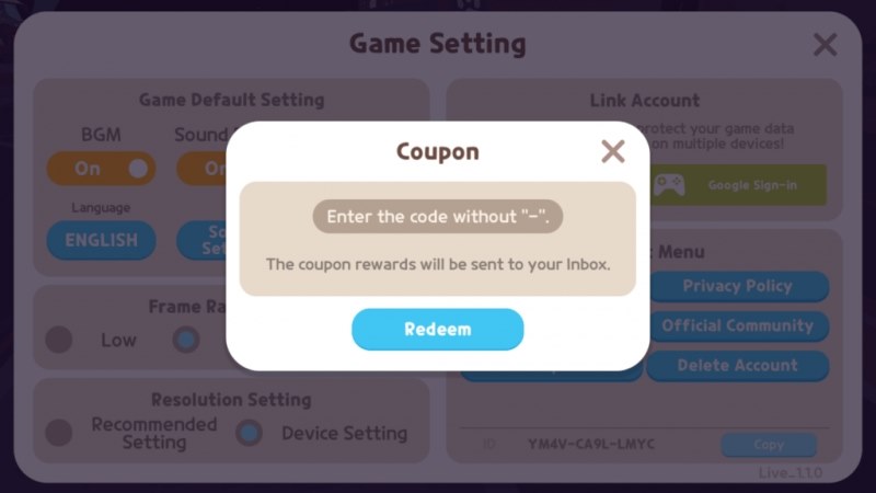 Chạm vào màn hình game > Tới Game Settings > Trong menu Support > Click Coupon. Nhập code game Play Together và nhấn nút Redeem.