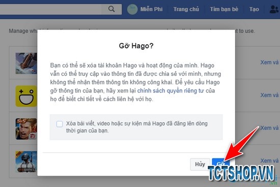 Bước 3: Hệ thống sẽ đề nghị bạn xác nhận lại một lần nữa. Để dọn dẹp hết các dữ liệu có liên quan, bạn hãy đánh dấu vào dòng Xóa bài viết, video hoặc sự kiện mà [Ứng dụng] đã đăng lên dòng thời gian của bạn, sau đó nhấn Gỡ.
