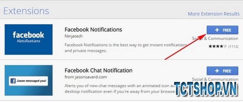 Bước 3: Tại ô tìm kiềm bạn nhập vào từ kháo “Facebook Notifications“, enter. Sau đó click chọn “+ FREE” để cài đặt trên trình duyệt.